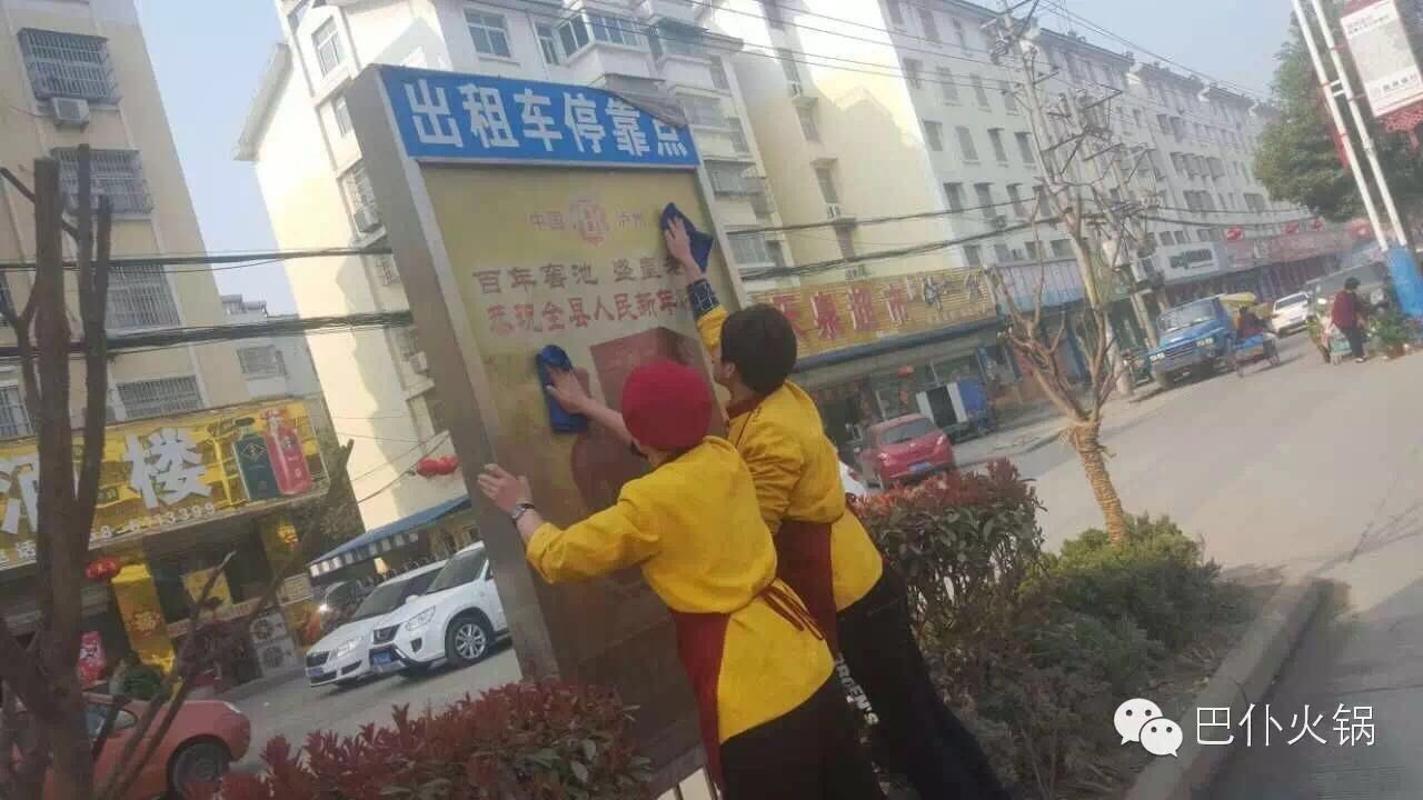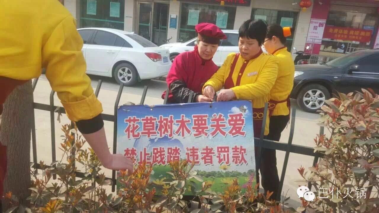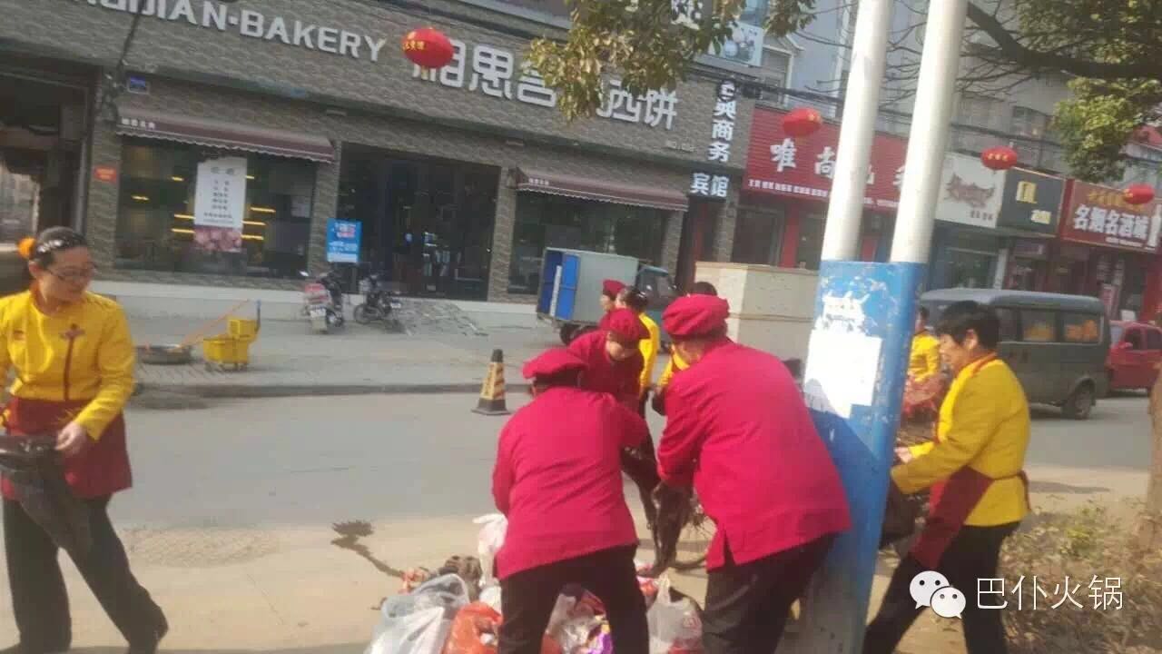 2016年3月16日,巴仆火锅组织各店员工在临泉、界首分别进行“让我们生活的城市更美丽”的公益活动。